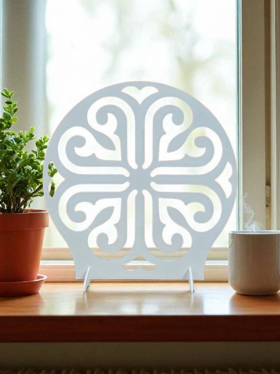 Sichtschutz aus 3 mm starkem Birkensperrholz mit fein geschnitztem Motiv. Erfordert außer dem Anbringen der Füße keine Montage und lässt sich beispielsweise zum Reinigen leicht abnehmen.