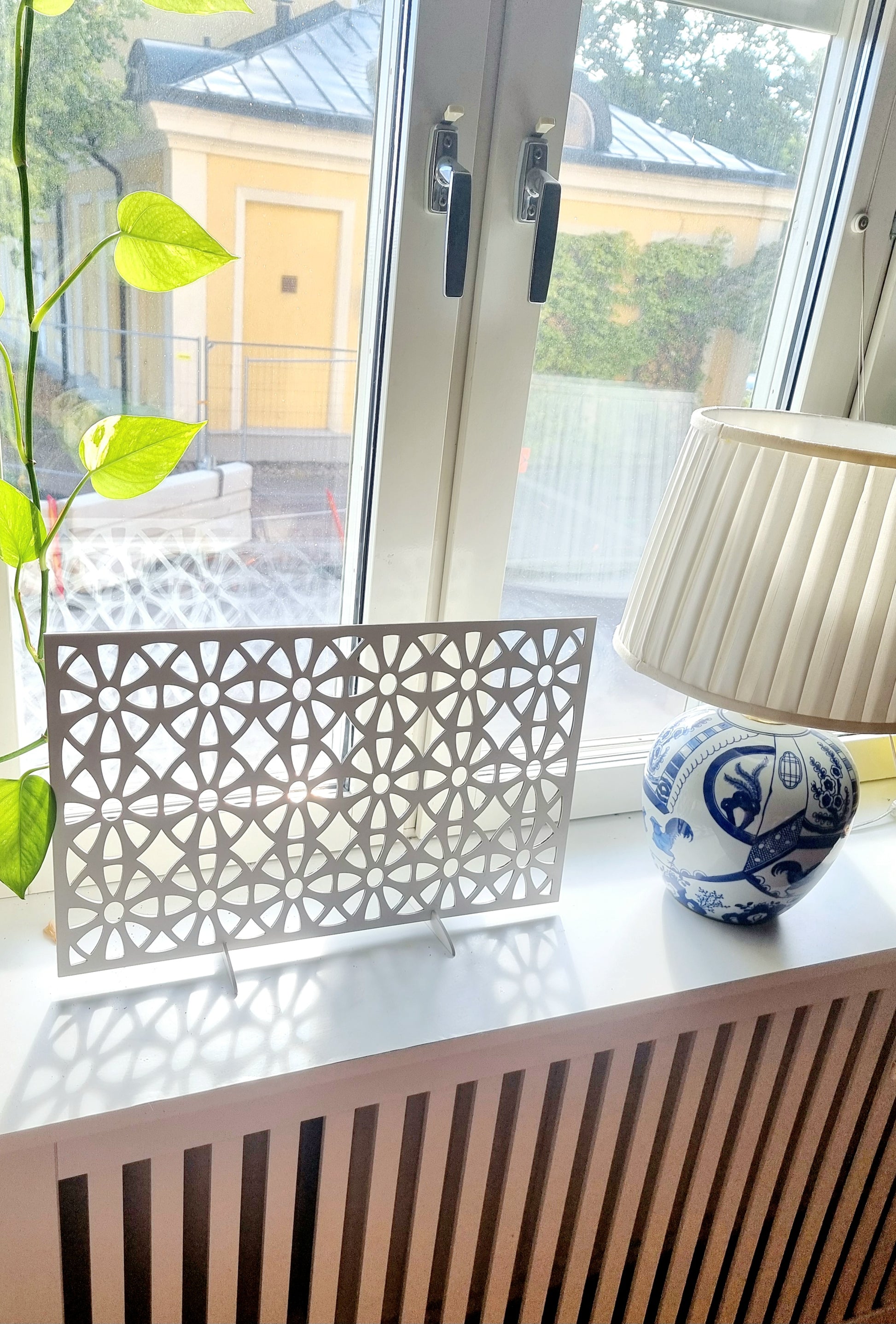 Sichtschutz aus 3 mm starkem Birkensperrholz mit fein geschnitztem Motiv. Erfordert außer dem Anbringen der Füße keine Montage und lässt sich beispielsweise zum Reinigen leicht abnehmen.