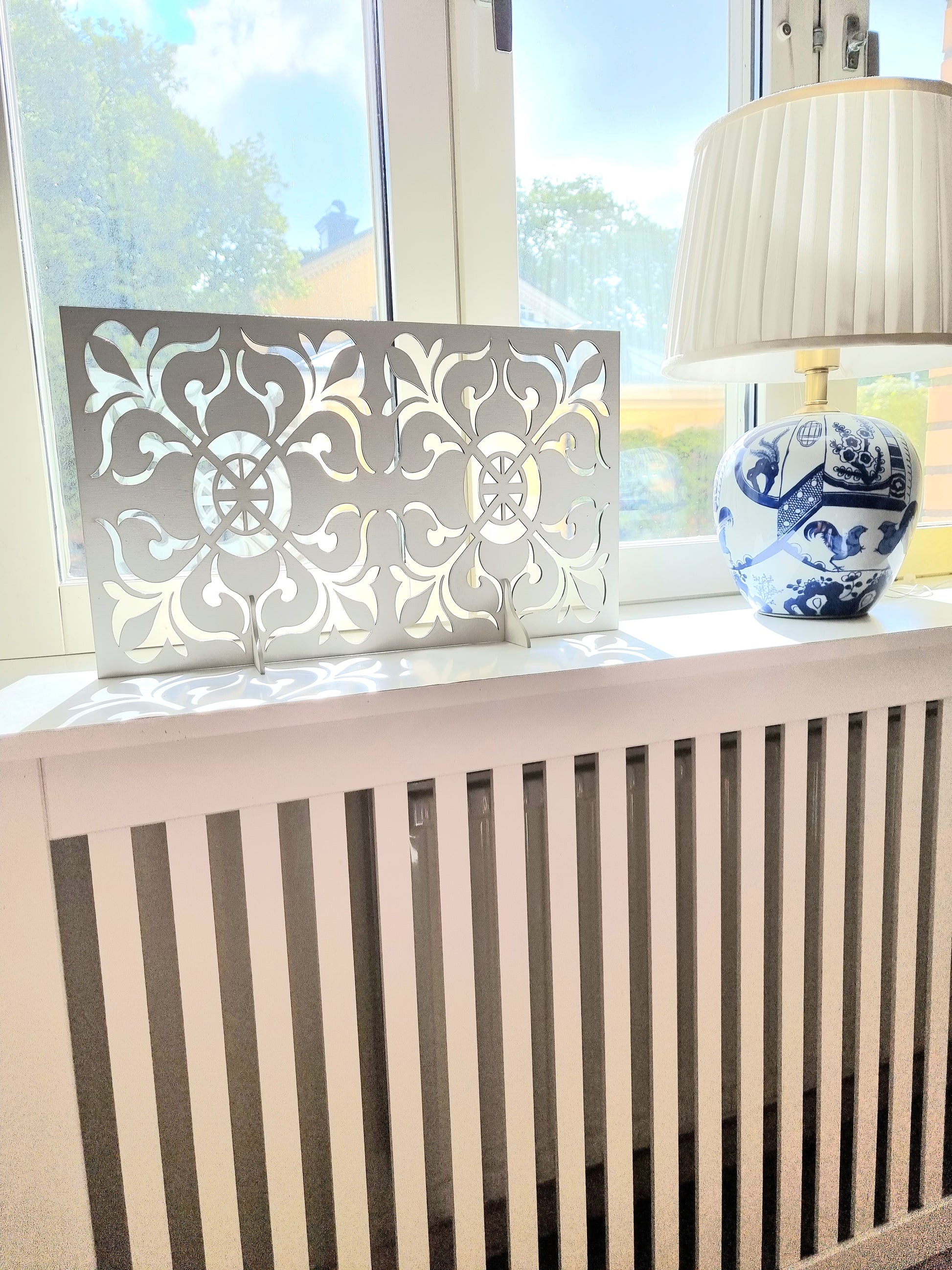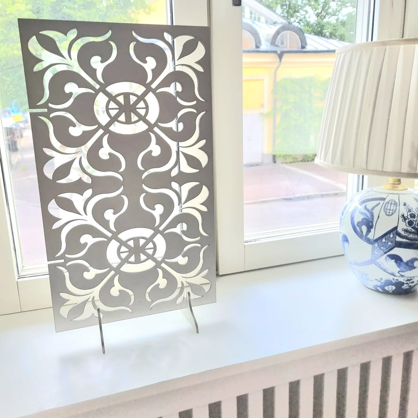 Sichtschutz aus 3 mm starkem Birkensperrholz mit fein ausgeschnittenem Motiv. 30 x 30 cm, aber auch in anderen Größen erhältlich. Maximale Größe: 30 x 47 cm. Erfordert keine Montage außer dem Anbringen der Füße und lässt sich leicht abnehmen, z. B. zum Reinigen.