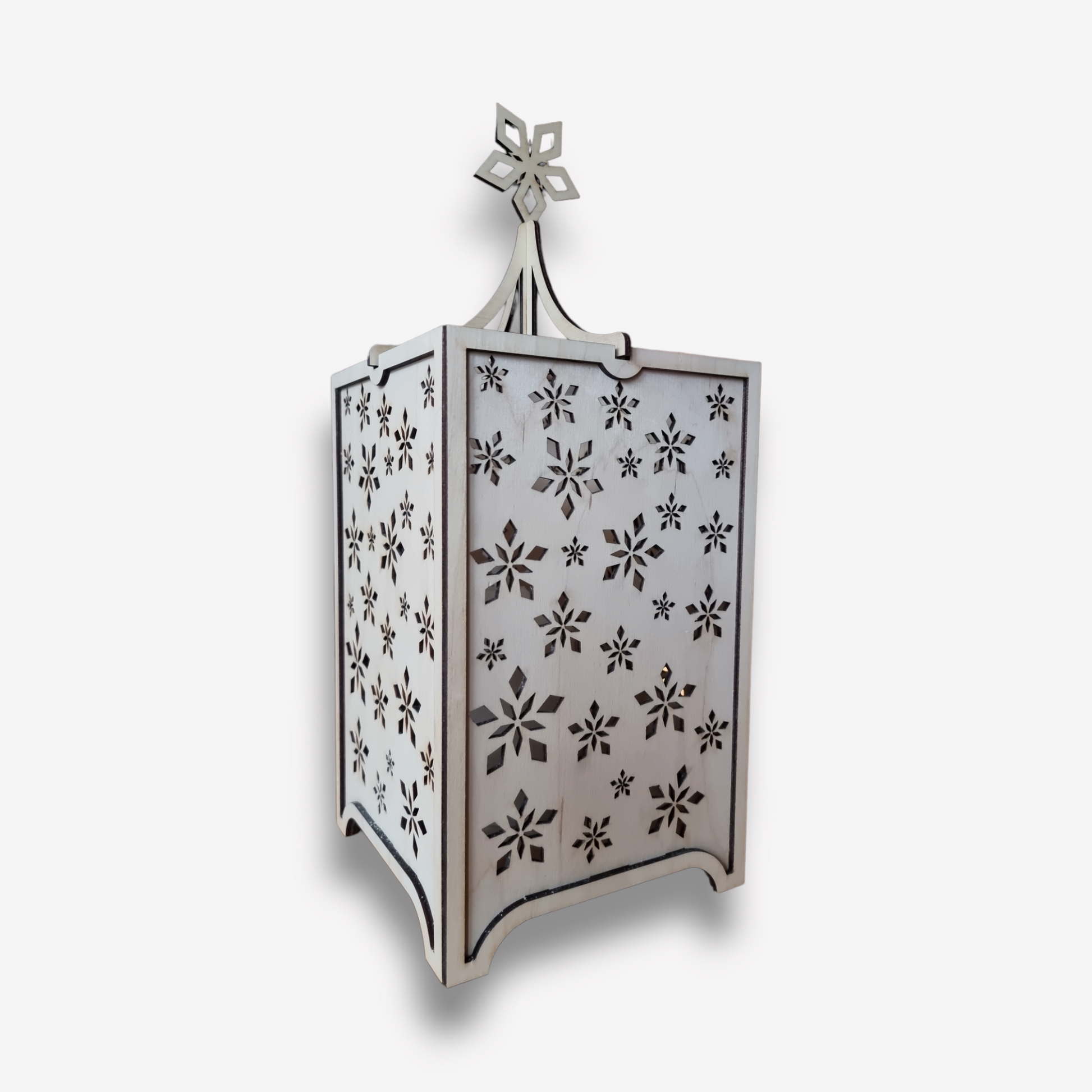 Große Holzlaterne mit fein geschnitzten Schneeflocken. Bitte beachten Sie, dass in der Laterne nur batteriebetriebene Lichter verwendet werden sollten.