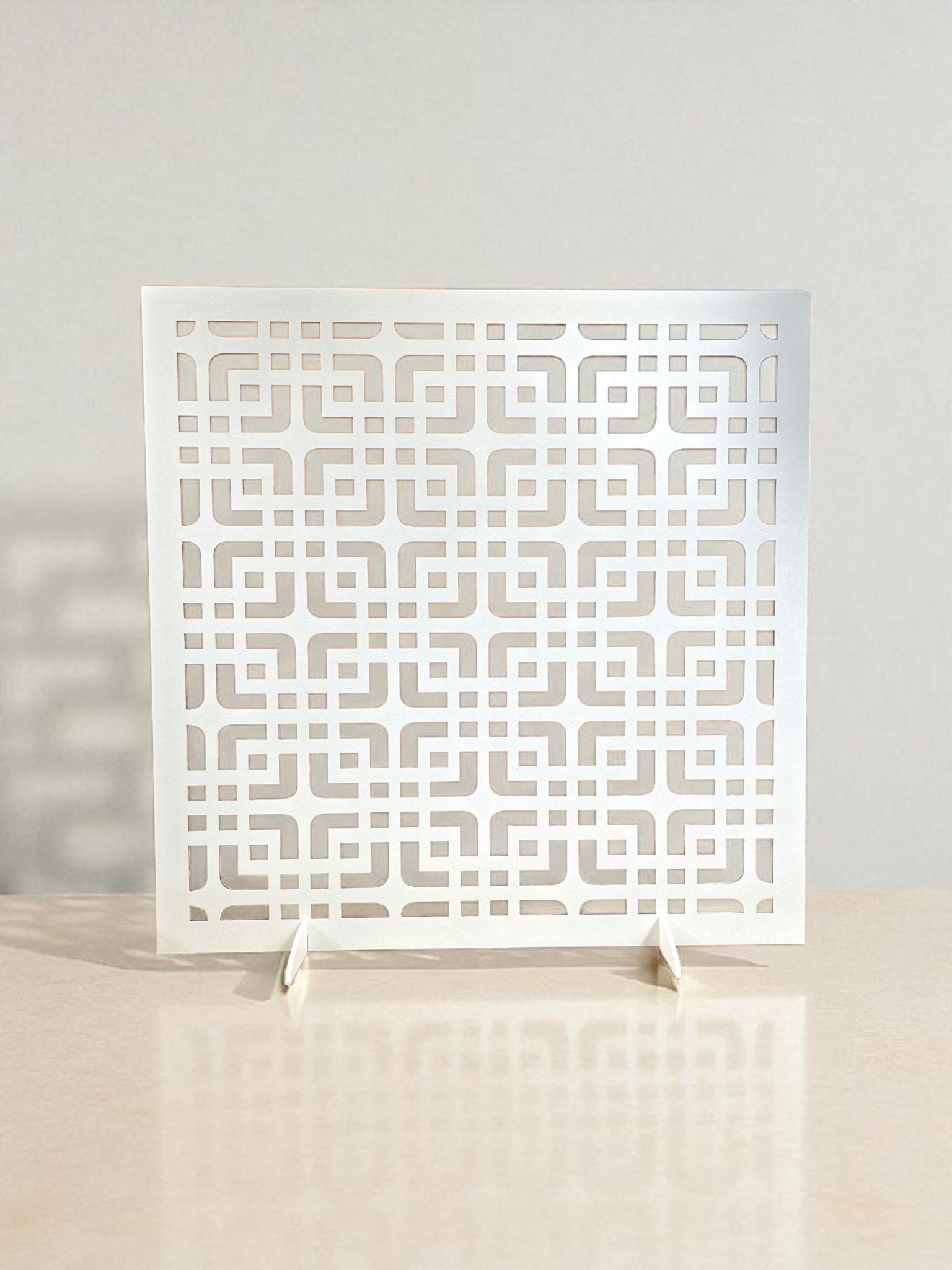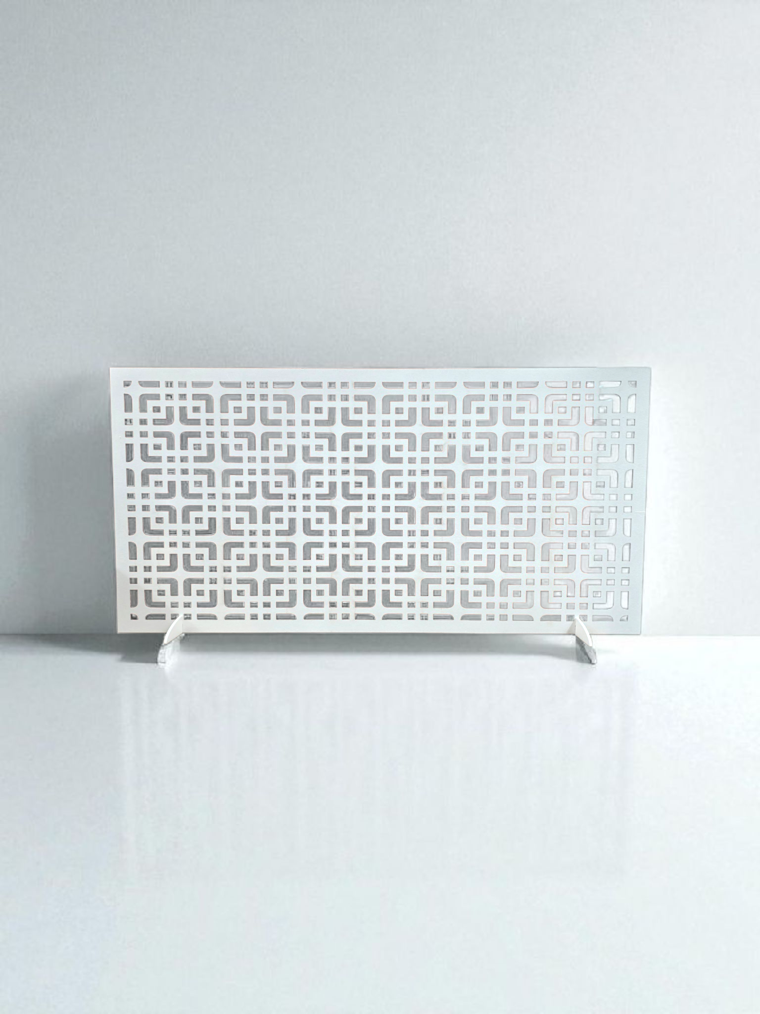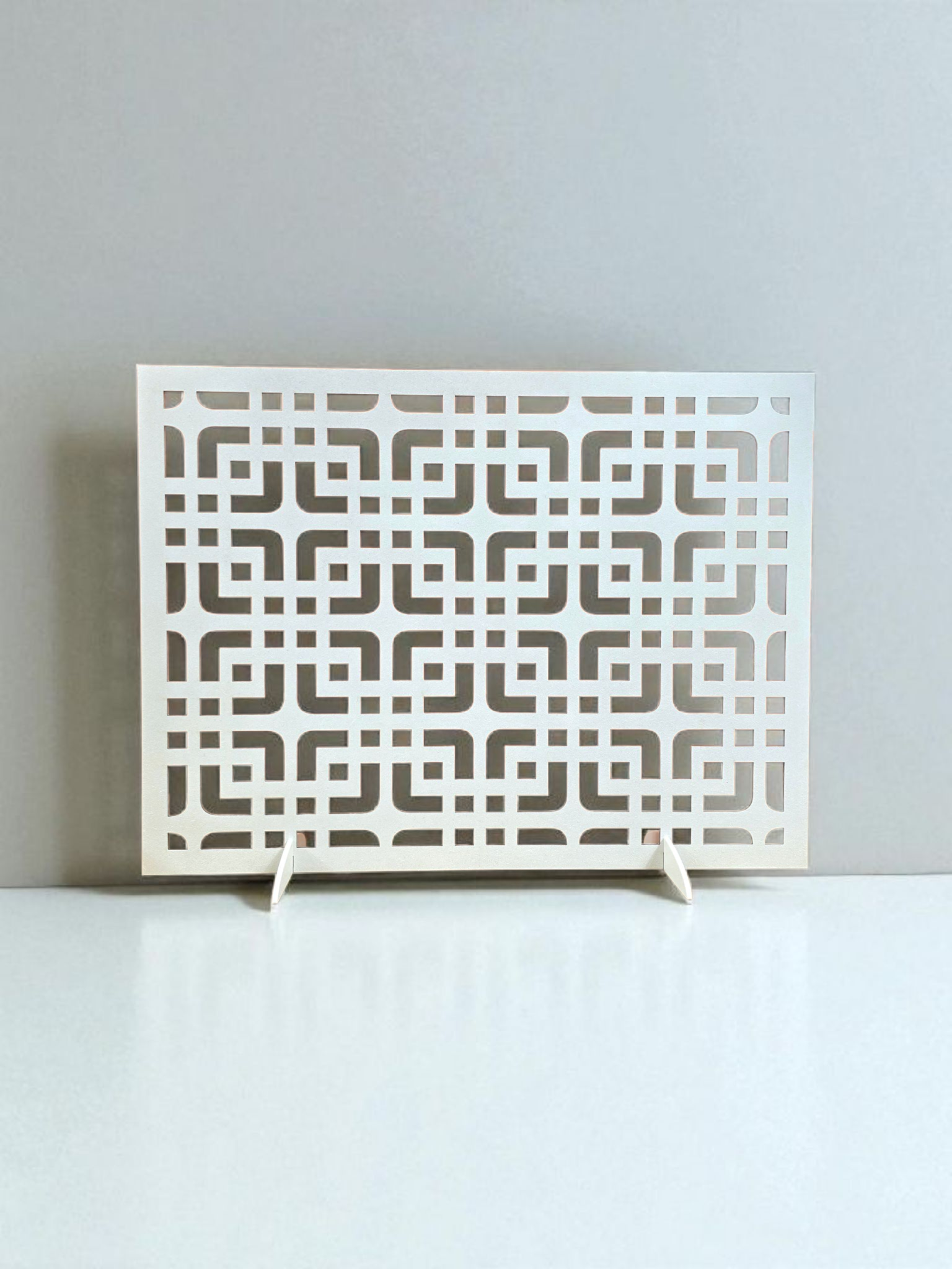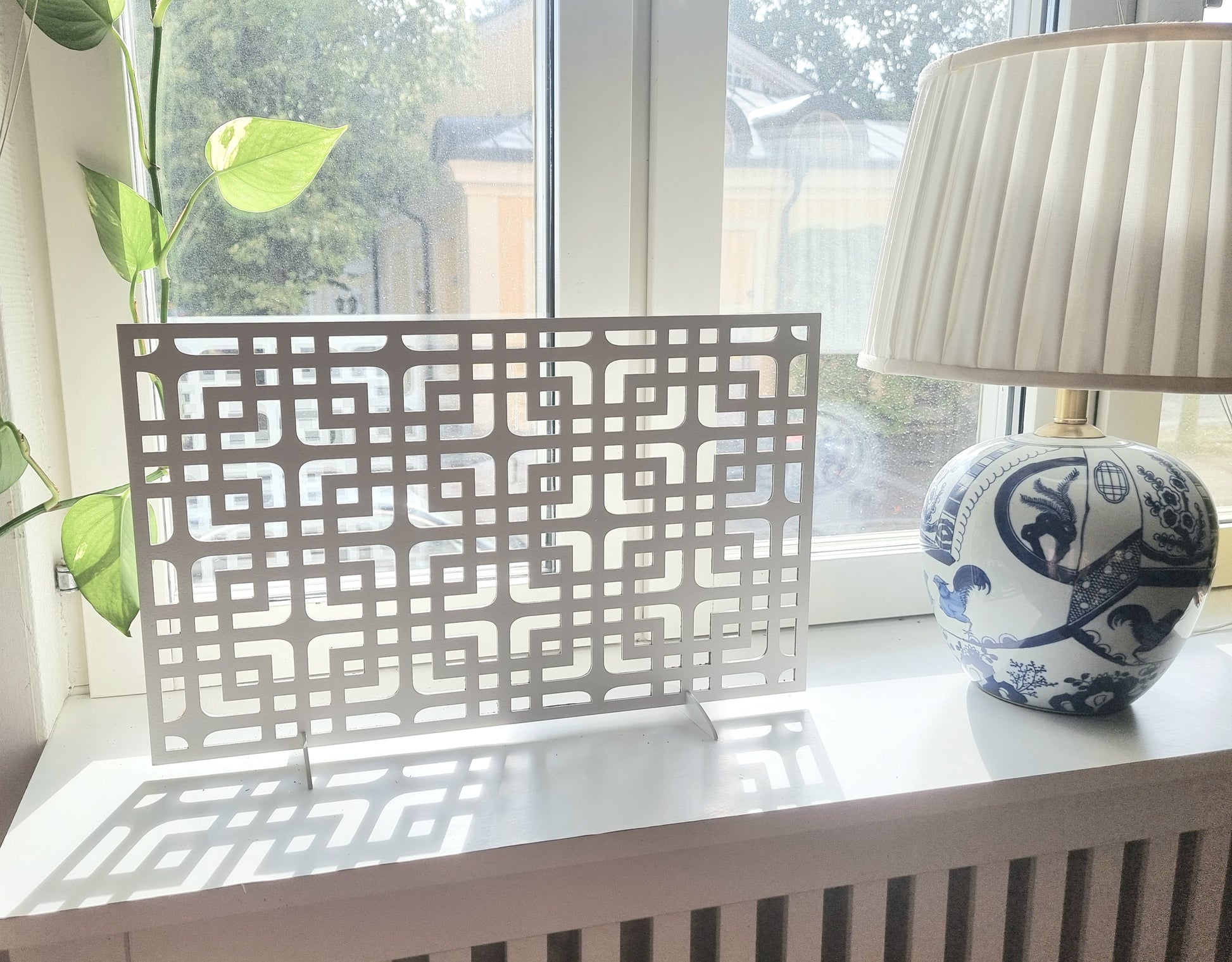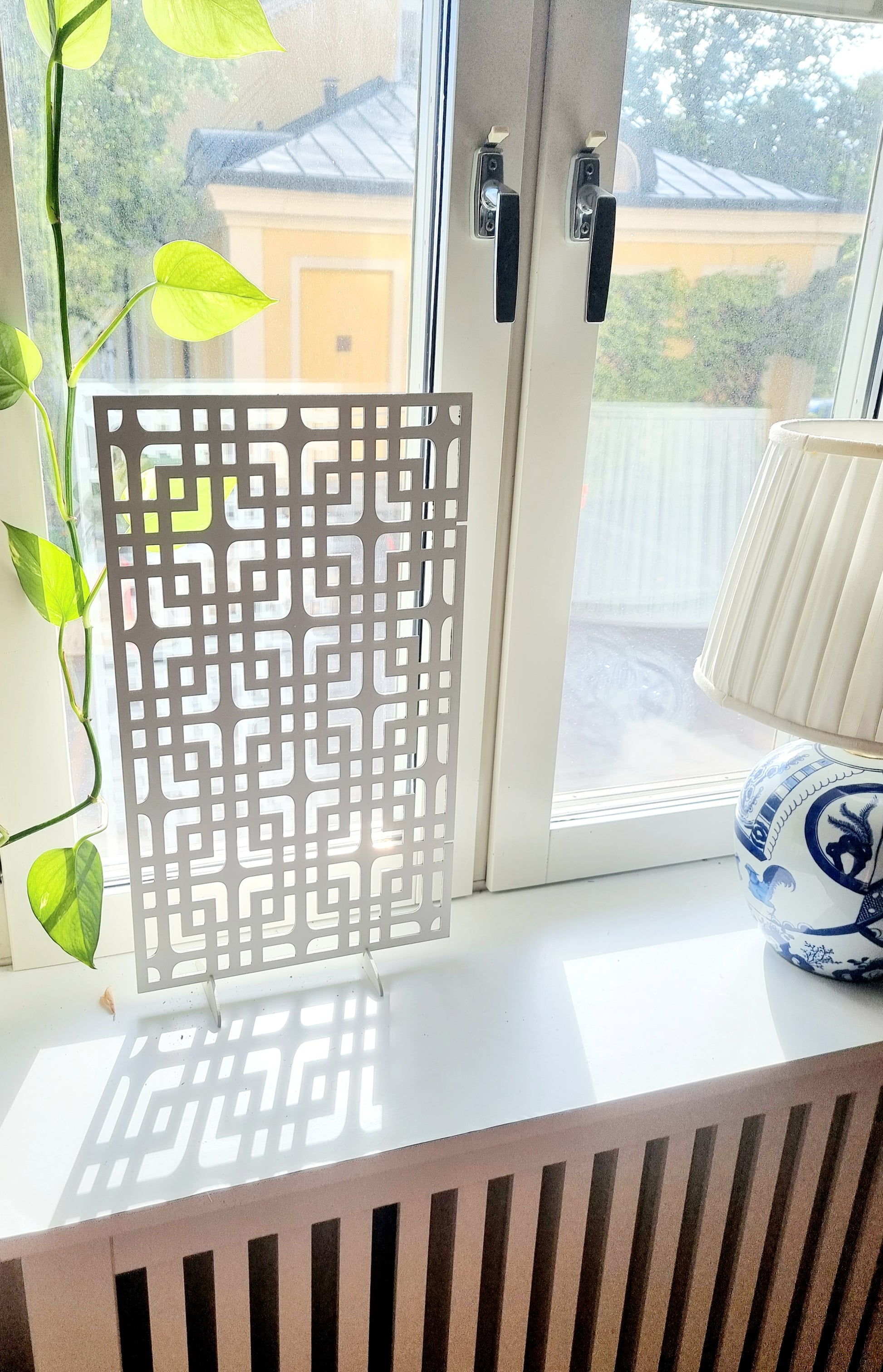 Insynsskydd i björkplywood, 3 mm tjockt med fint utskuret motiv. Kräver ingen annan montering än att sätta dit fötterna och är lätt att lyfta bort vid t ex städning.